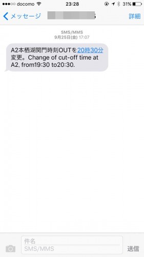 ここで携帯をチェックするとSMSでここでの関門延長の旨が配信されていました。