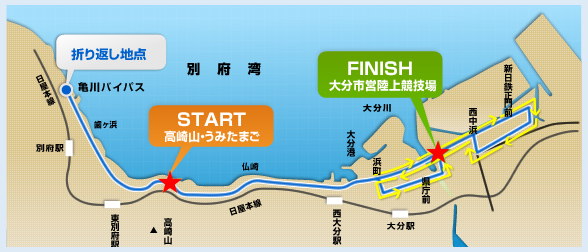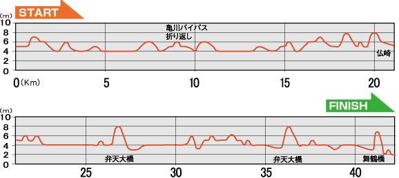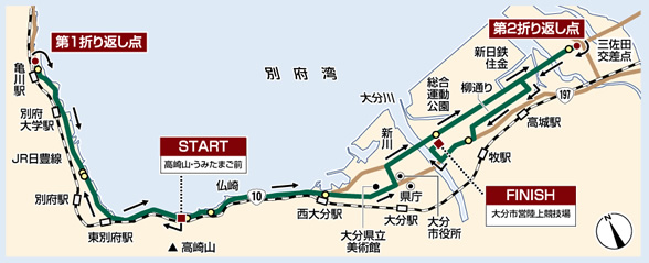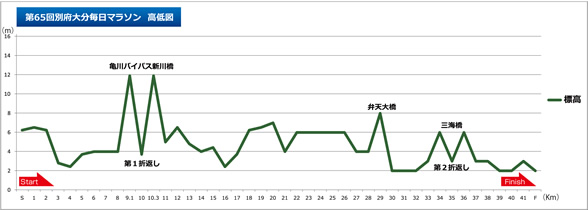 後半の大分川にかかる橋の通過が昨年の弁天大橋往復と舞鶴橋の計3回だったのが、今回は行きの弁天大橋1回のみになったというのが最大の変更点でしたが、この10km地点の橋の往復でのアップダウンが増えているのは難点でしょうか。