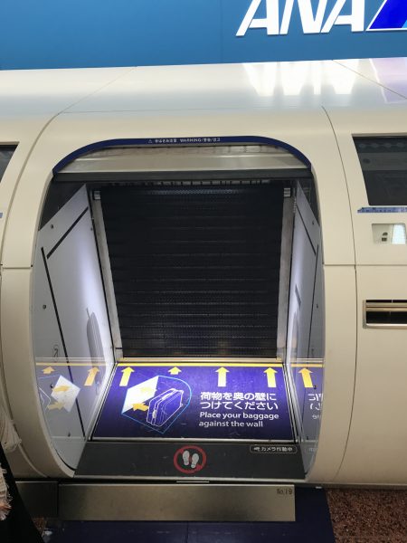 荷物を入れて搭乗用バーコードをかざせば自動でタグが発行され、それを荷物につけると扉が閉まって預入完了です。