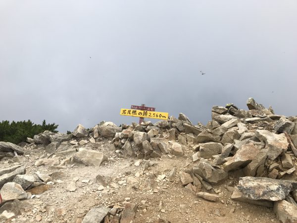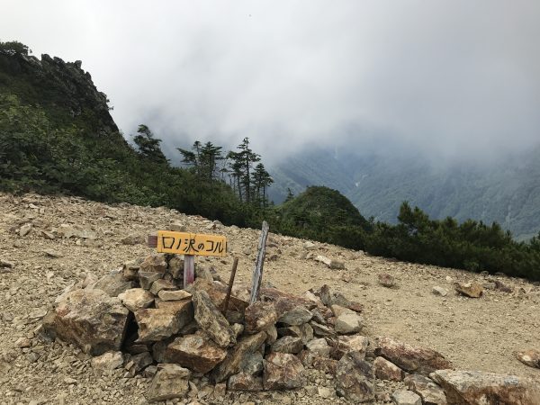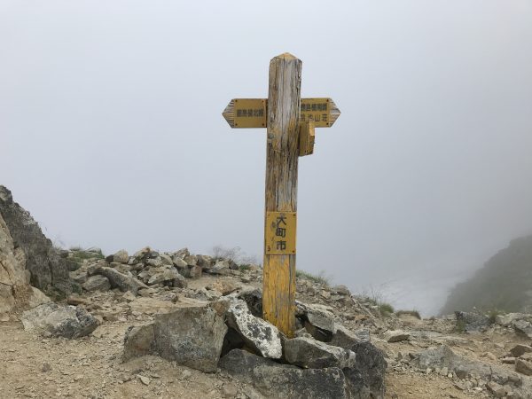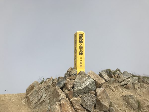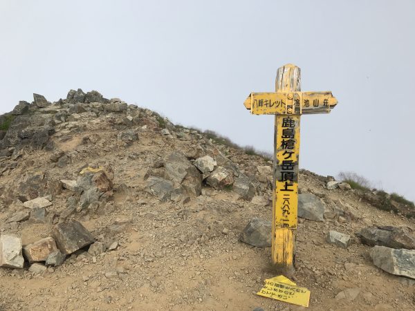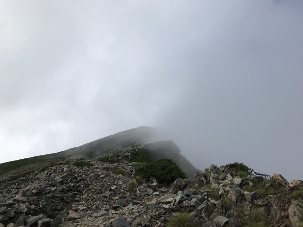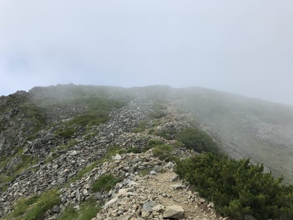 スタートして直後は霧の中を進んで40分ほどで杓子岳との分岐点に。