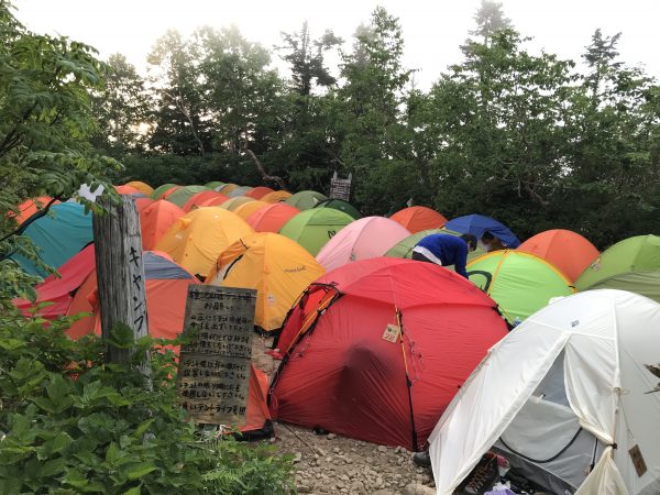 テント場と登山道の間の隙間になんとか1張分のスペースがあったのでそこに張ってとりあえず何とかなりました。