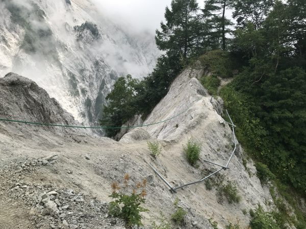 両側が切れ落ちて今にも崩れそうな狭い道でロープ一本だけが頼りです。