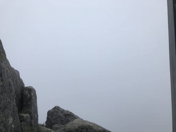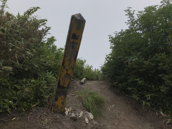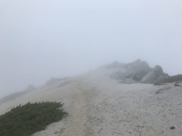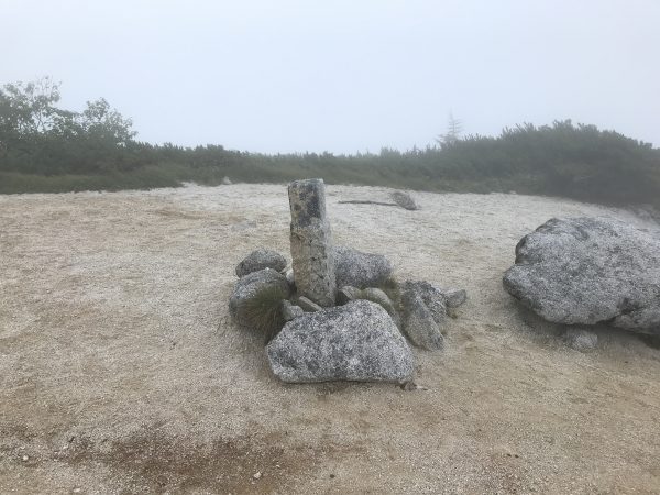 この山頂付近は砂礫になっていて踏み跡が見えづらく霧の中なので道に迷いそうになります。