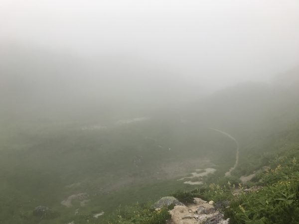 曇っていて何も見えないので山頂には行かずに直接烏帽子小屋に行ってもいいかなと思ったのですが