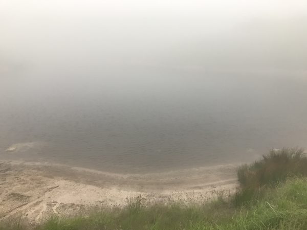 出発直後は霧の中。