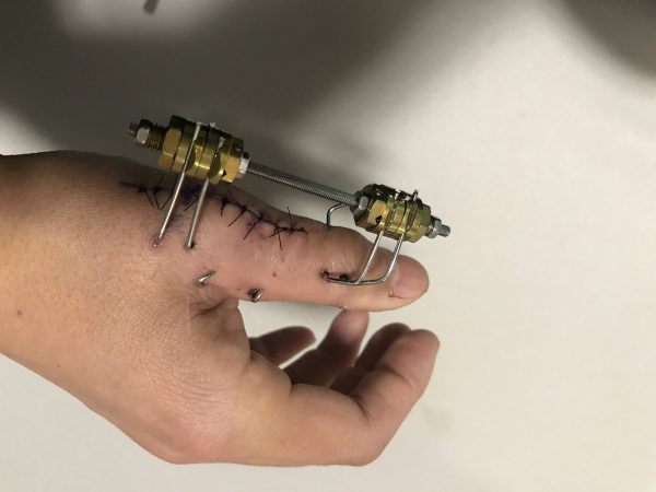 創外固定をつけてこんな感じになりました。(この写真は術後1週間後に撮りました。)