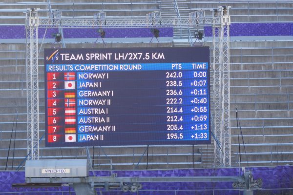 午前中に行われた前半ジャンプではJAPAN I(山本涼太選手・渡部暁斗選手)がトップと7秒差の2位、JAPAN II(永井秀昭選手・渡部善斗選手)が1分33秒差の8位でした。