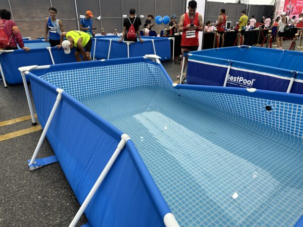 気温も高くなってきたので数kmごとにあるエイドのたびにバケツの水を浴びて身体を冷やします。