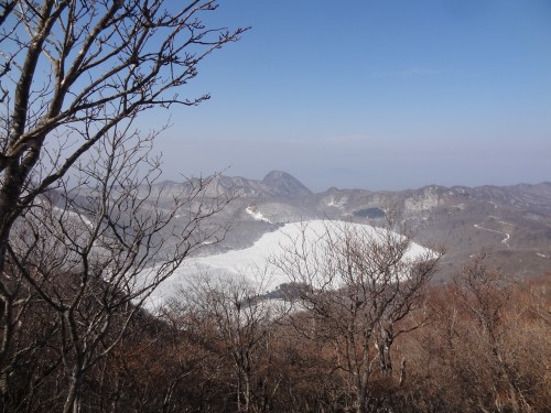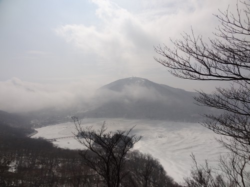 山頂からは凍結した大沼が見えます。
