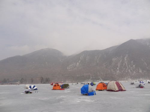 ワカサギ釣りの人たちが多数いましたが、氷上ということもあり山頂よりも寒く感じました。